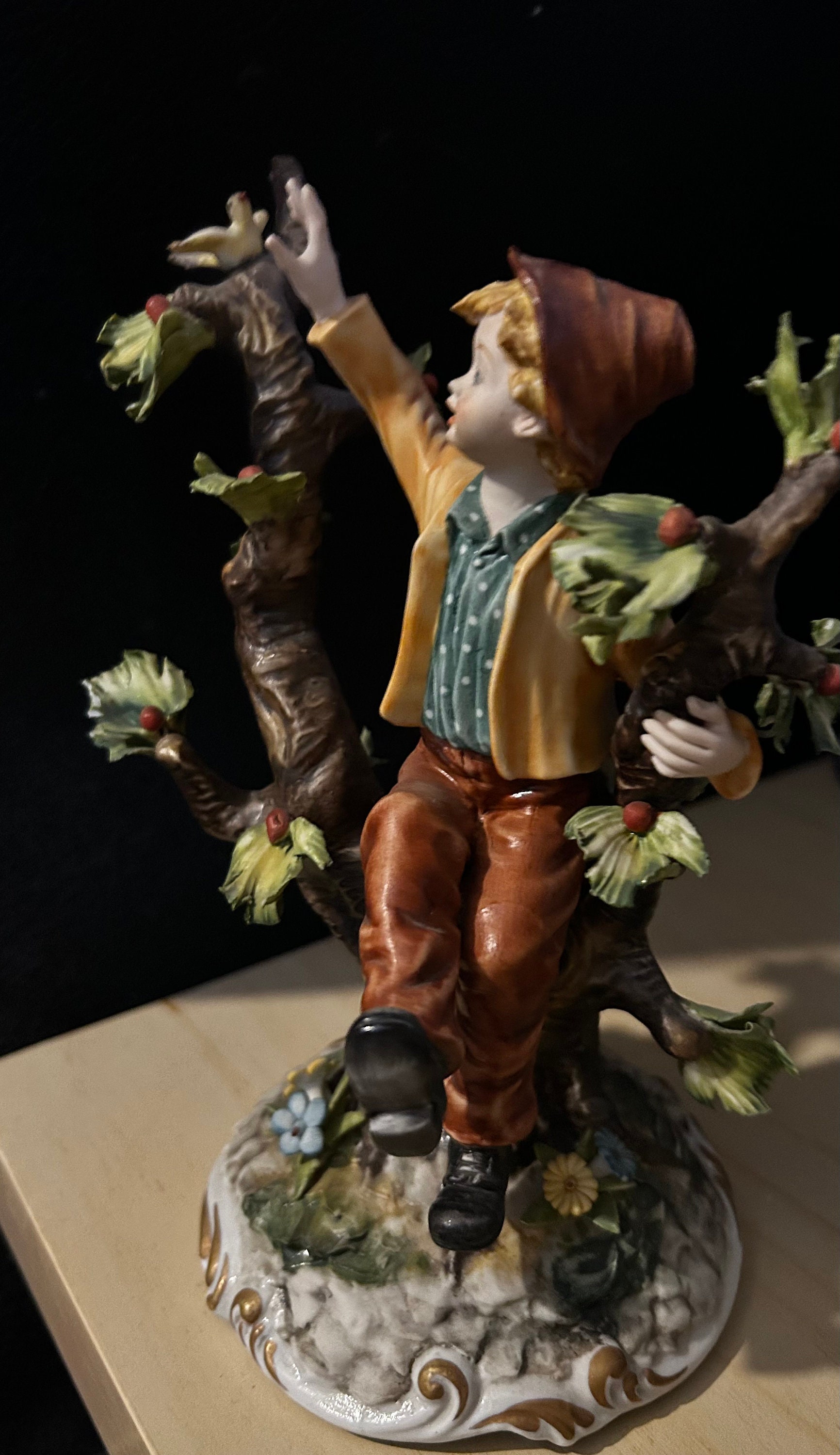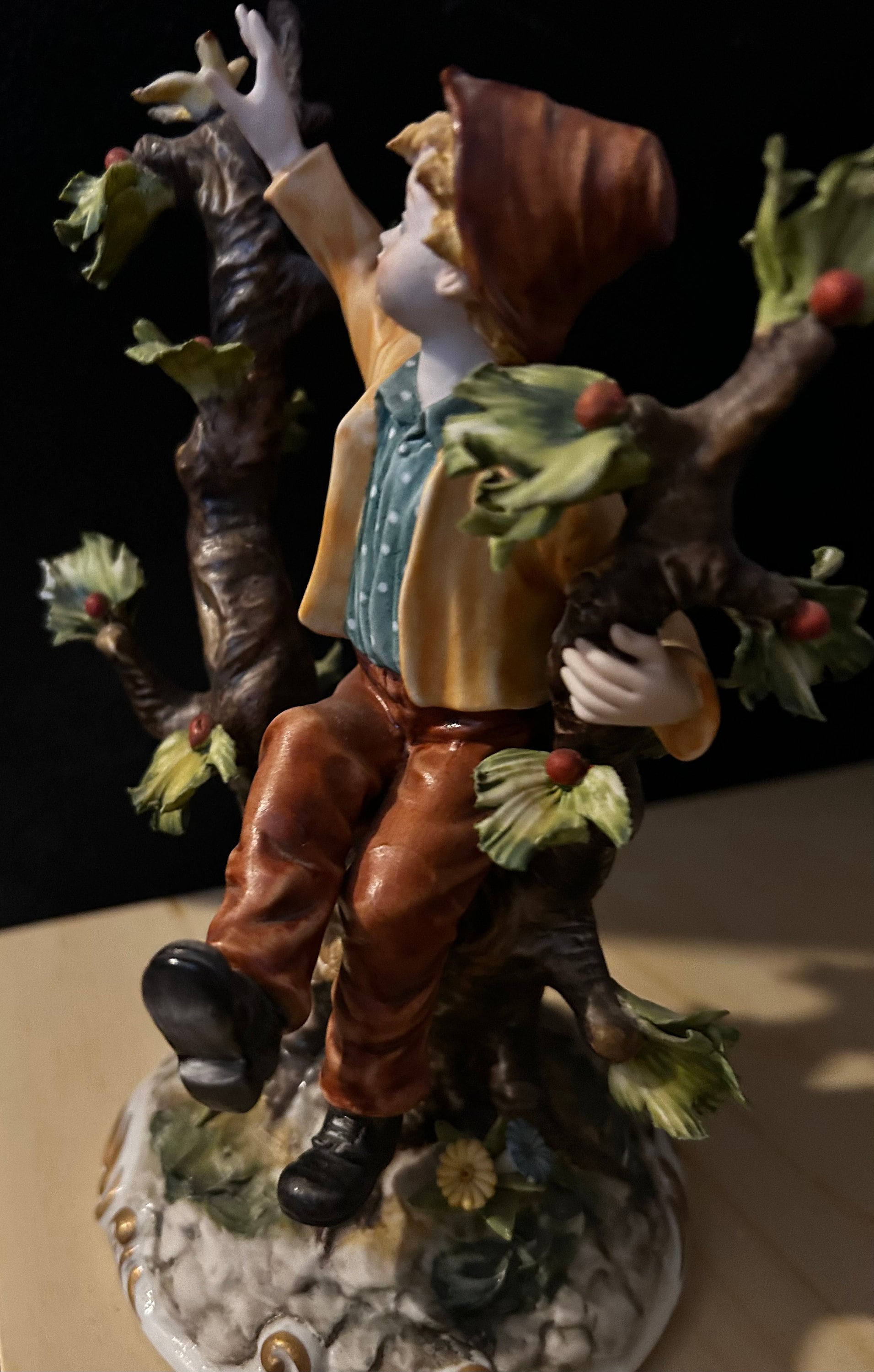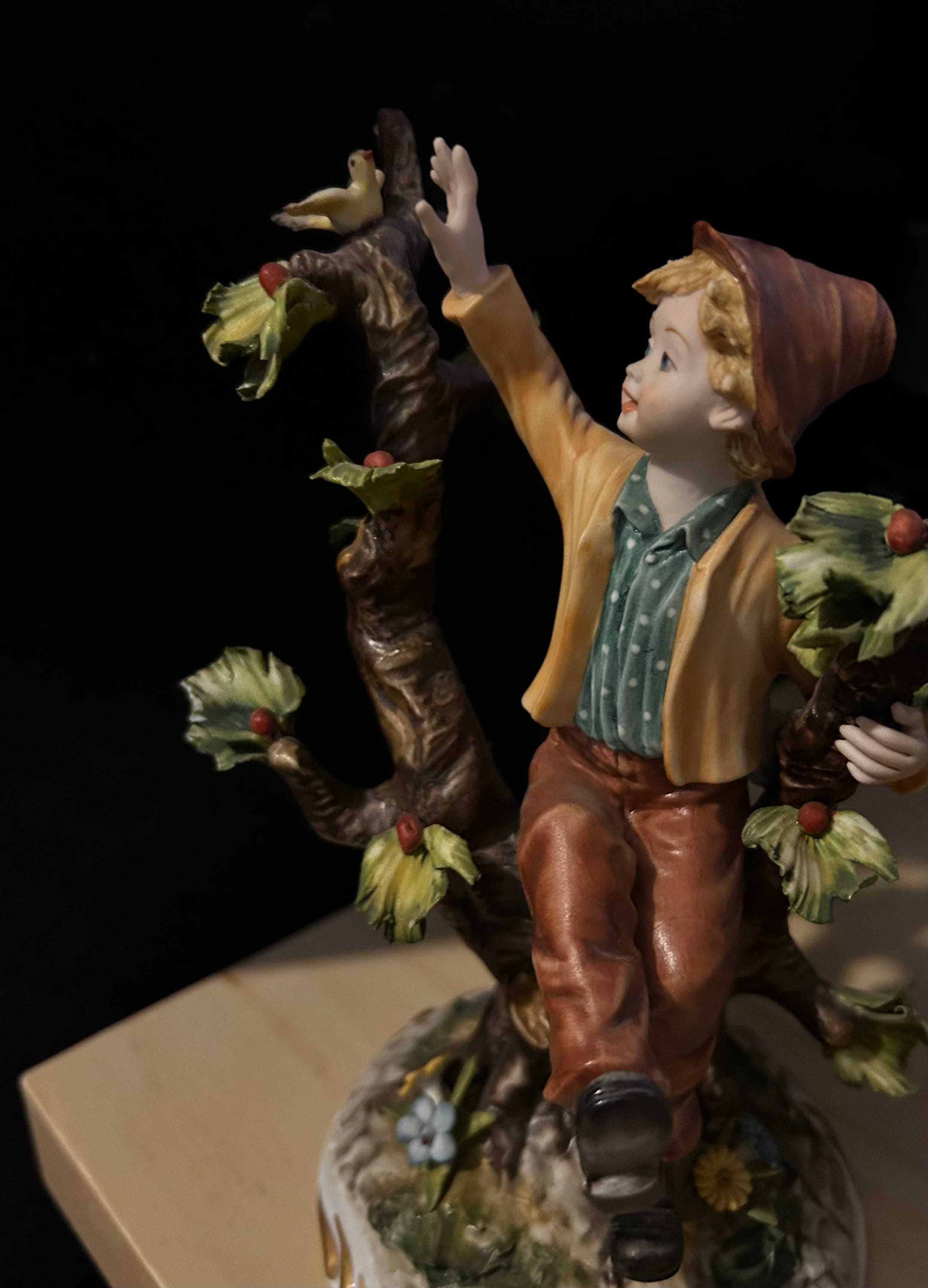 This fine piece of porcelain, Vintage Large Italian Porcelain Figurine of Young Man sitting on apple tree branch, by Capodimonte
