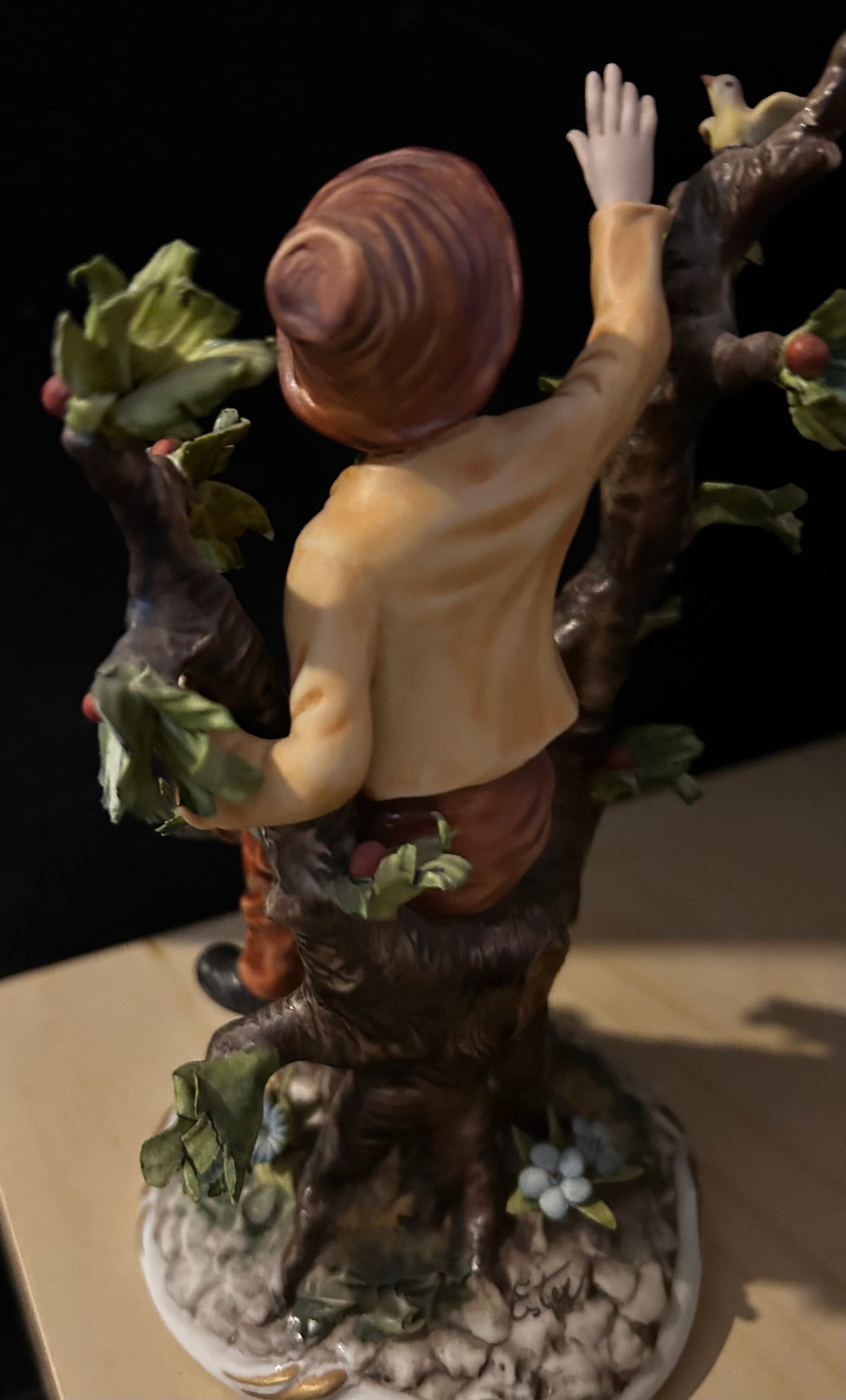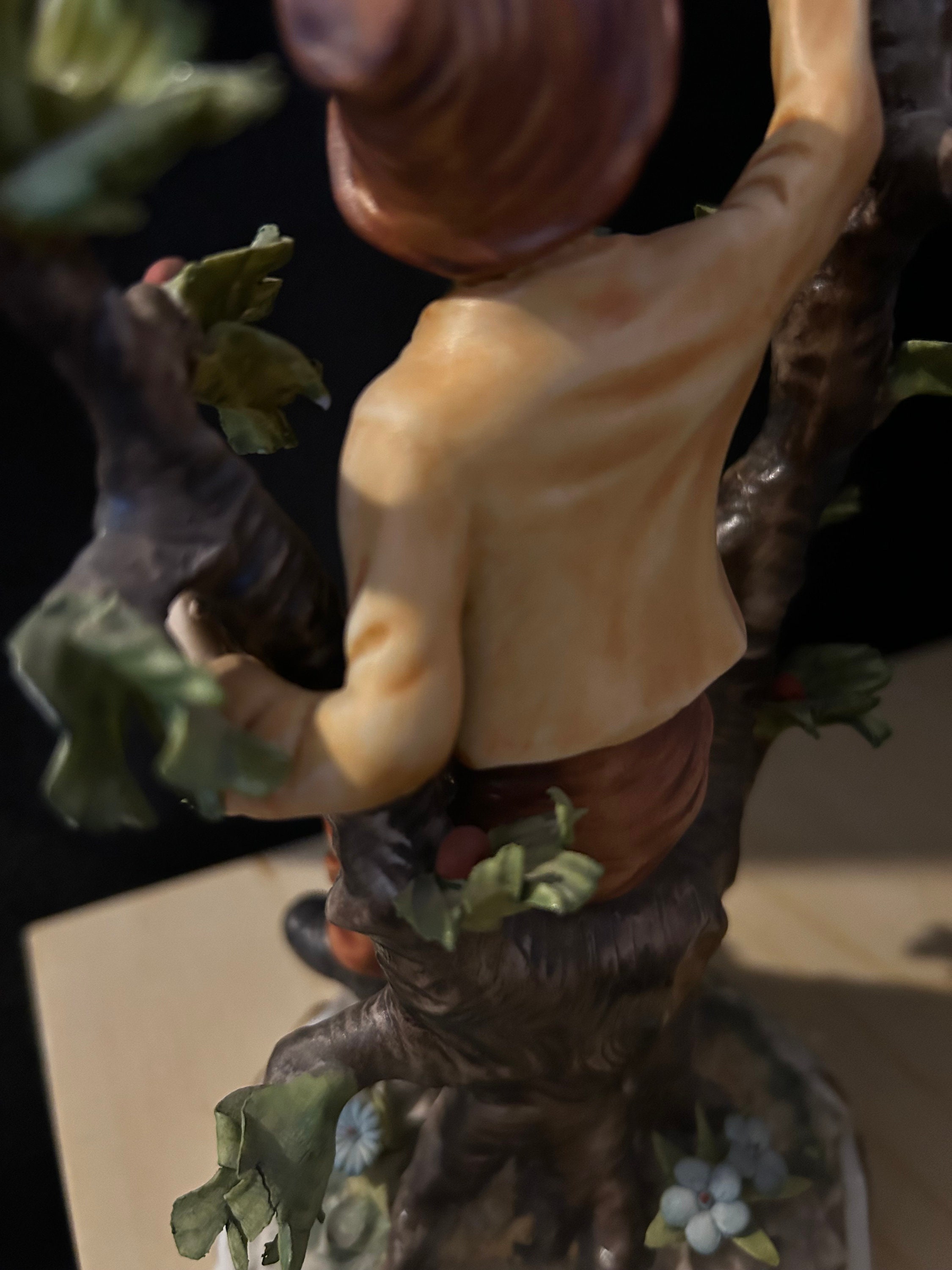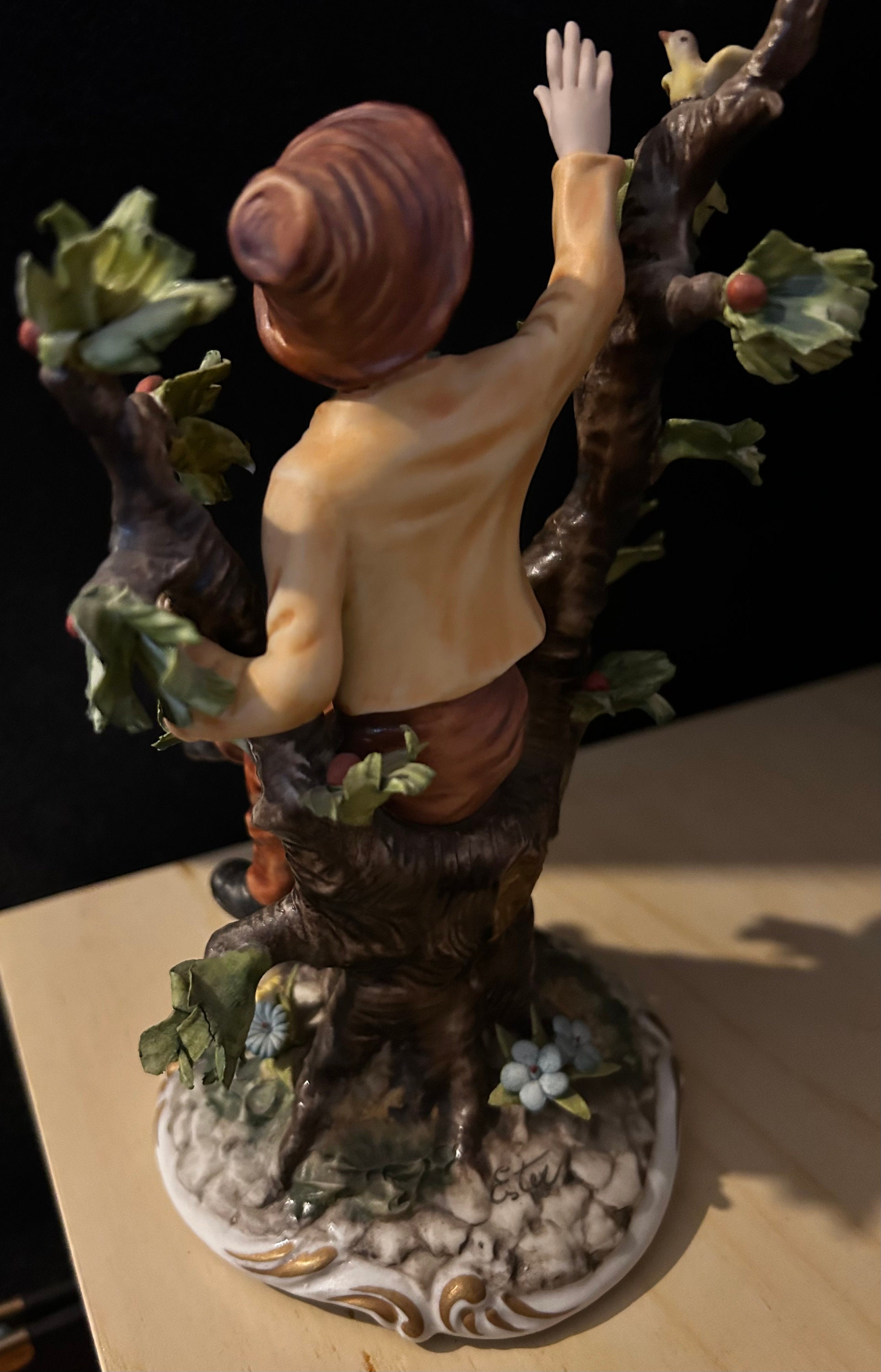 This fine piece of porcelain, Vintage Large Italian Porcelain Figurine of Young Man sitting on apple tree branch, by Capodimonte
