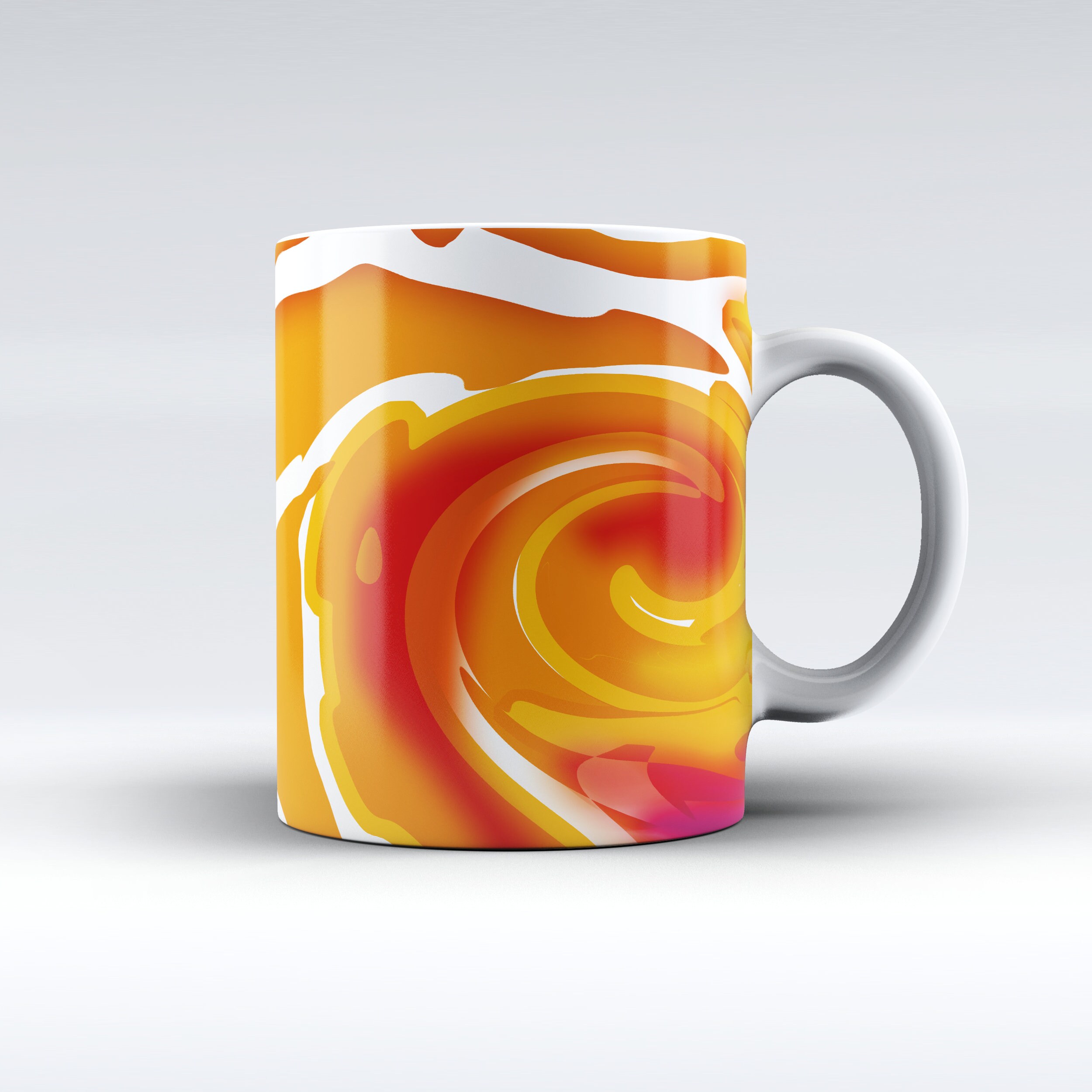 A delightful modern fresh abstract painted swirl design by hooman khaknegar moghaddam, made to order,in sunset colours, stretching the front as shown and back of cup. Despatch in 3-5 days and about 8 days postage. its a 11 oz, special coated ceramic cup using the best Techniques.